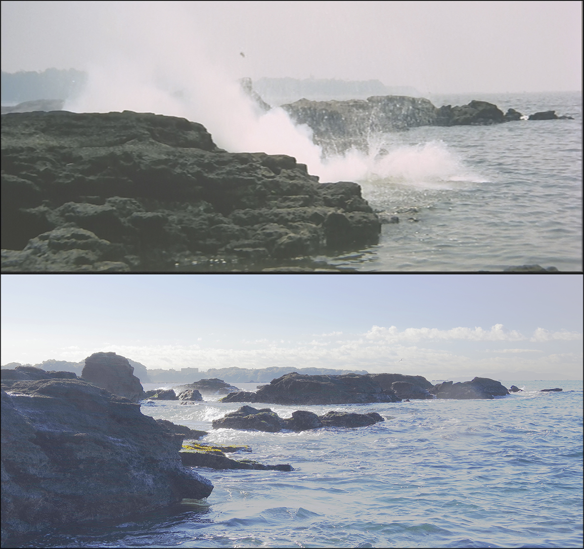 タイホウバッファローが現れたカットからロケ地が三浦半島の黒崎海岸に移る。タイホウバッファロー背後のコンクリートの構造物は戦時中の弾薬庫の遺構。黒崎海岸の内陸部に第二次大戦中に陸軍の横須賀第三航空基地があった為、周辺の海岸線に同様の遺構が幾つか残っている。